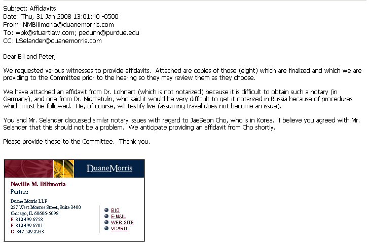 "She told me that she was shocked at what I told her about Mize's affidavit," Taleyarkhan wrote, "and that Purdue's attorney [Kealey] or Dunn had not revealed the affidavits to her. I then took the initiative and sent them directly to her after consulting with my attorneys."