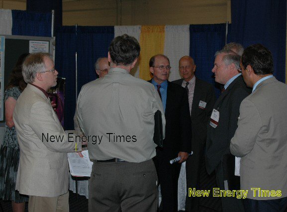 Frank Gordon explaining results to General Larry Farrell and other physicists and journalists at the exhibit booth. (Photo Steven Krivit)
