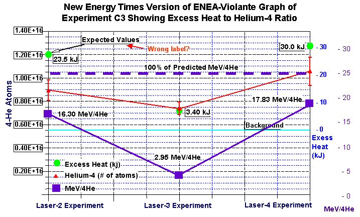 In the case of the second value, the measured MeV/4He being only 12.38% of the "cold fusion" prediction is inexplicable, given that the relationship displayed on Violante's graph gives the impression of a close agreement.