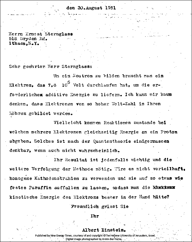 "You may be interested to learn that in the course of the past two months I have been able to obtain experimental evidence for the formation of neutrons from protons and electrons in a high-voltage hydrogen discharge," Sternglass wrote.